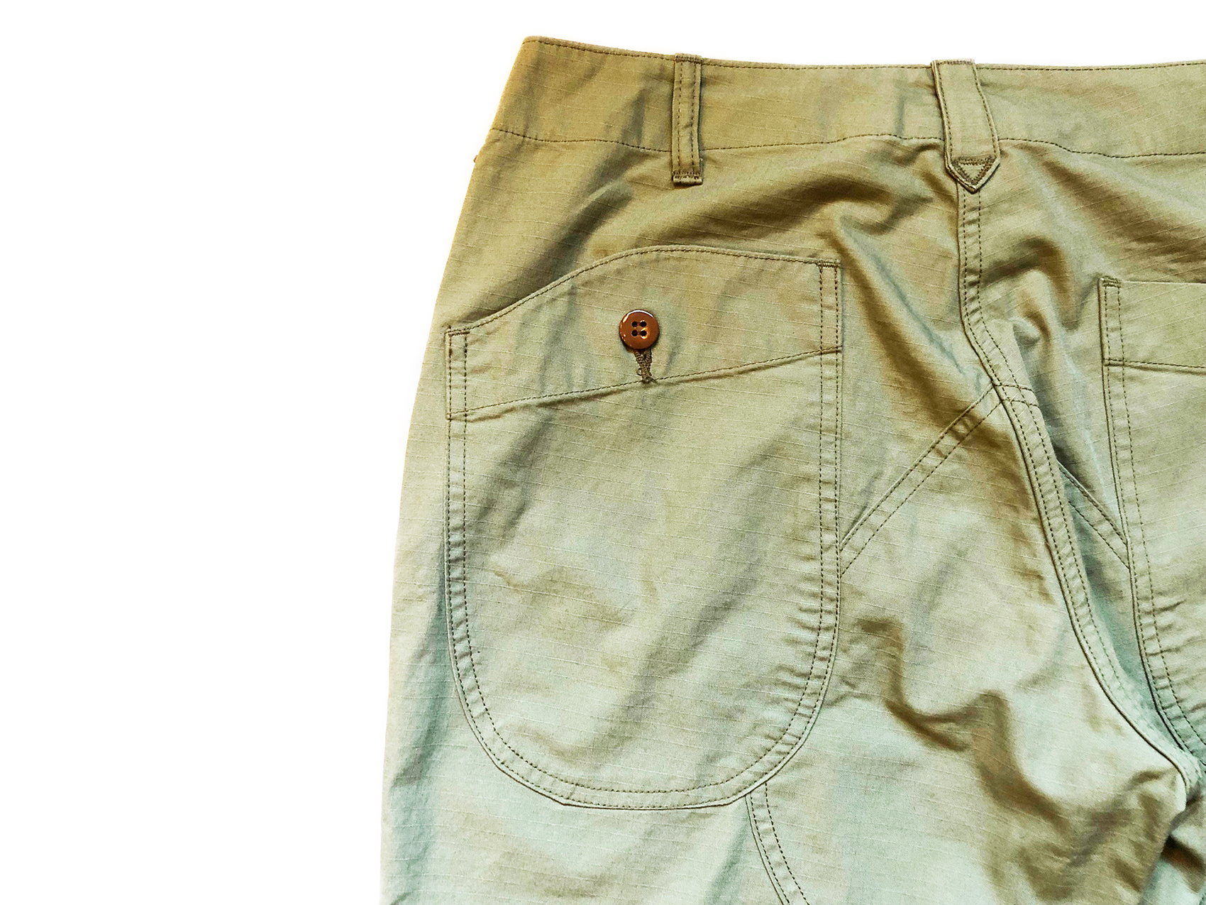 通常のベイカーパンツのフロントポケットは角のある四角のパッチポケットを使用してますが